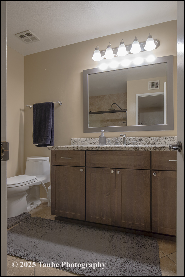 In the primary bath, we lowered the center section of the vanity from stool height to chair height, making them more comfortable now and better suited for the future. We preserved the existing flooring, lighting and mirrors.